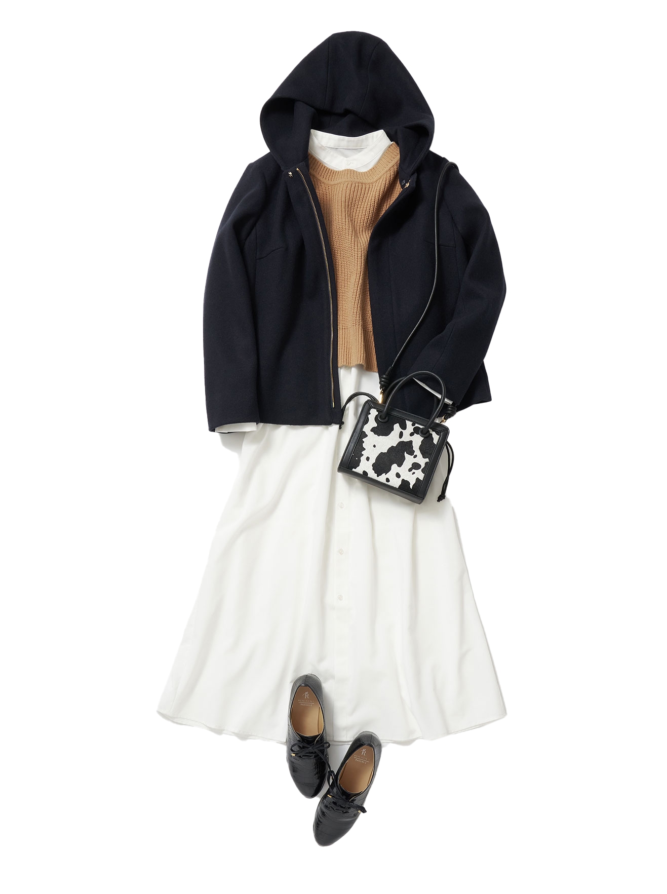 アクティブな雰囲気のアウターにはレディライクなスカートを合わせるのが今年らしい。