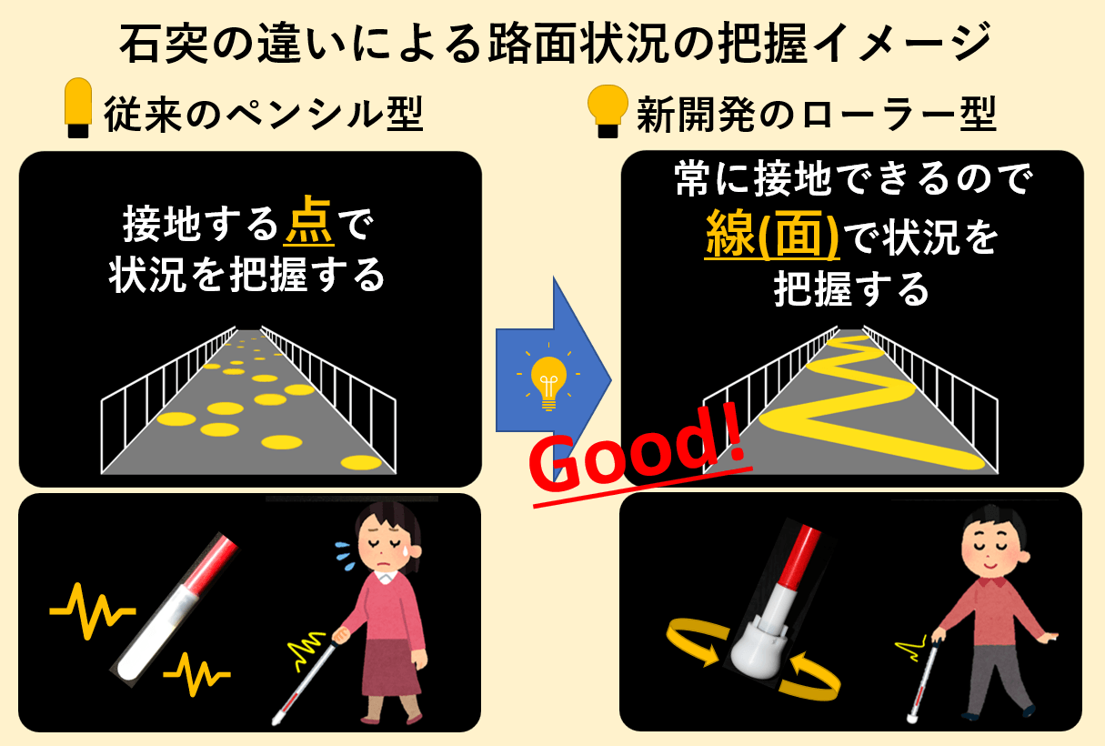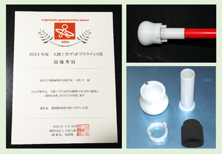 特別支援学校の吉岡 学(よしおか まなぶ)教諭が、自らの研究から視覚障がいのある人が使用する白杖の先っぽ「石突(いしづき)」を開発しました。視覚障がいのある子どもたちは白杖歩行の練習をしますが、従来の石突がついた白杖では歩くことにも大きな不安があります。今回の新開発の石突は、路面状況の把握が優れおり「歩くのが楽しい」とテスト使用した子どもたちからの感想があります。