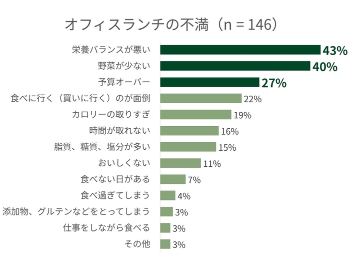 オフィスランチの主な不満は「栄養バランス(43%)、野菜が少ない(40%)、予算オーバー(27%)」の3つ。