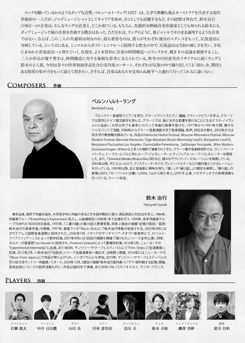 現代オーストリアを代表する異色の作曲家ベルンハルト・ラングと日本の鈴木治行の音楽は、どこか似ている。この二人の作曲家の共通点は何なのか。それは、彼らがそれぞれ独自のスタンスをもって、反復語法に対峙している、という点にある。