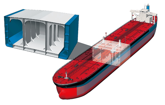 船側部に高延性厚鋼板を使用することにより(図2)、衝突による超大型原油タンカー等からの大規模油漏洩リスクを低減することを可能にしています。高延性厚鋼板は強度・靭性、溶接性などの加工性も従来鋼と同等であるため、造船所の施工負荷は変わりません。
