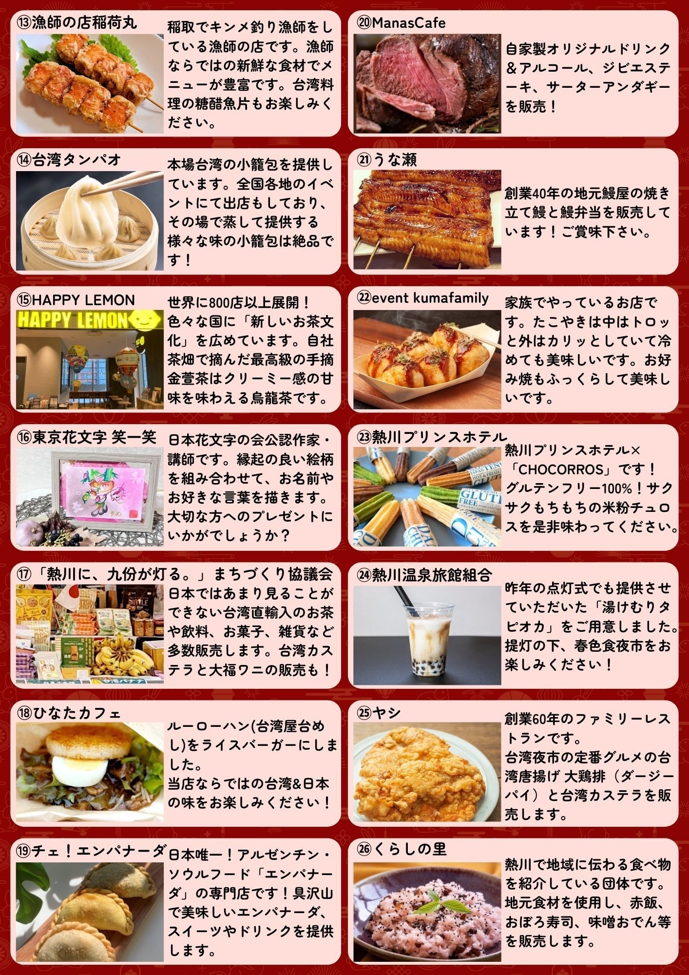 主なイベント内容:中華獅子舞の演舞、二胡の演奏、天燈上げ、熱川道灌太鼓の演奏、ご当地キャラ大集合(熱川温泉公式キャラクター「どうかん先生」、熱川バナナワニ園公式キャラクター「熱川ばにお」、伊豆急行公式キャラクター「いずきゅん」、伊豆アニマルキングダム公式キャラクター「アニキンメ」)、スタンプラリー抽選会