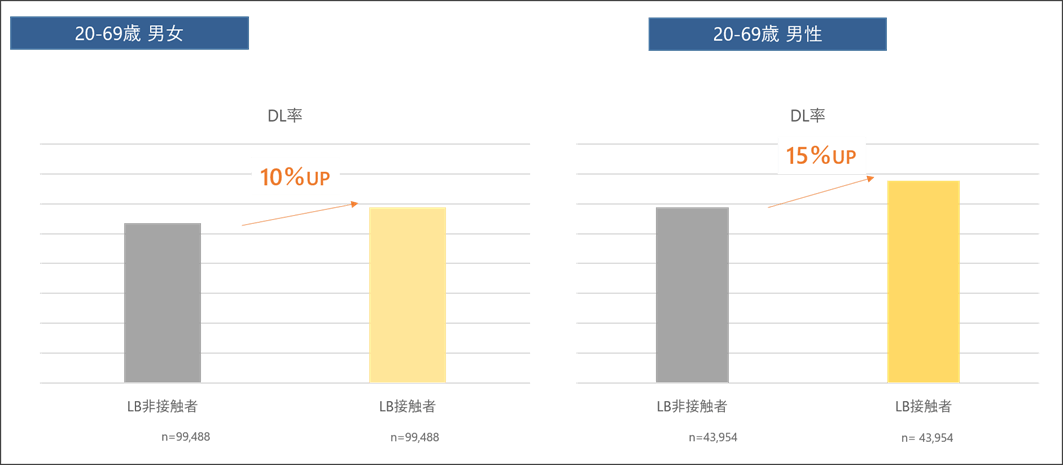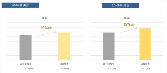 広告接触者全体では、非接触者と比較しダウンロード率が10%アップ。今回のターゲットであった男性に絞ると、15%のアップが確認出来た。