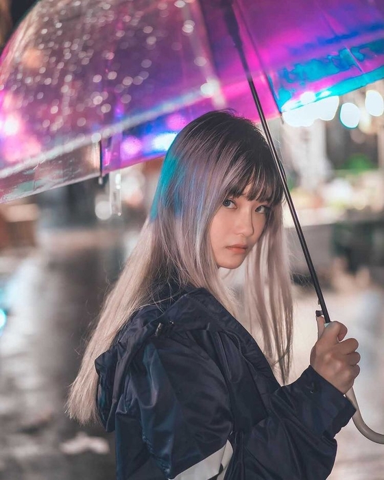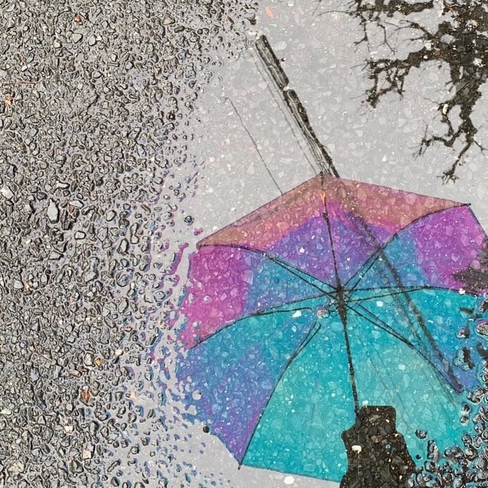 傘本体だけでなく、オーロラ色の影が地面や水溜まりに映し出されエモい写真を撮ることが出来ます。