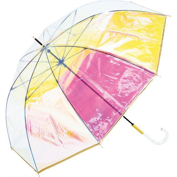 オーロラ生地にそれぞれゴールドとピンクのパイピングがデザインされています。傘の持ち手はクリアなアクリル素材を合わせているのでスタイリッシュな印象。存在感のあるオーロラ傘をコーディネートの中心に。