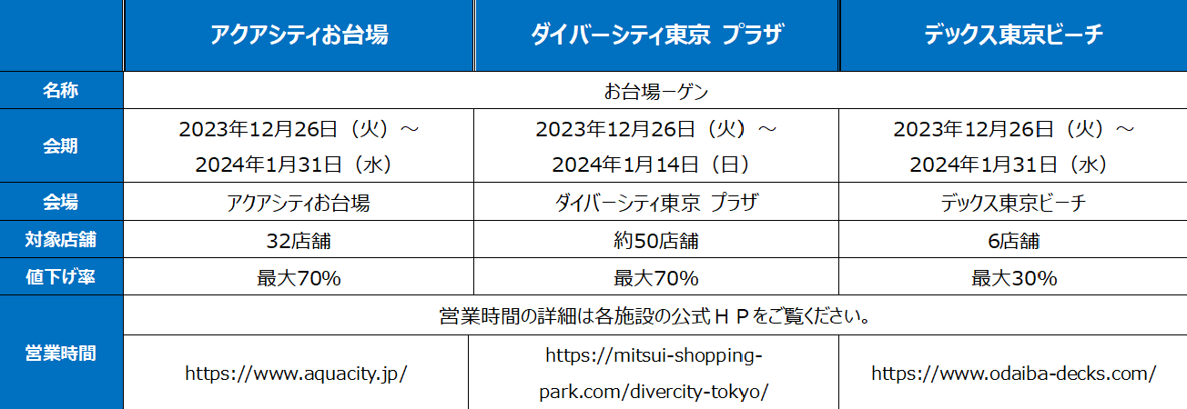 アクアシティお台場(運営:三菱地所プロパティマネジメント株式会社)、ダイバーシティ東京 プラザ(運営:三井不動産商業マネジメント株式会社)、デックス東京ビーチ(運営:東急不動産SCマネジメント株式会社)の大型商業施設3施設にて、お台場の冬を盛り上げるべく、2023年12月26日(火)より、合同バーゲン「お台場ーゲン」を同時開催いたします。