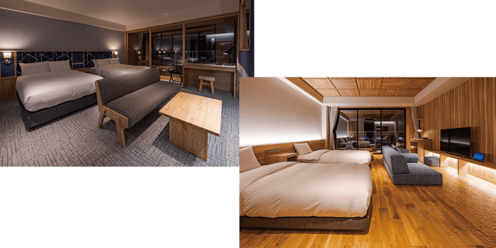 お部屋は「プレミアムデラックスツイン(写真左)」もしくは「プレミアムデラックス-NAGURI」のどちらか選択可能。