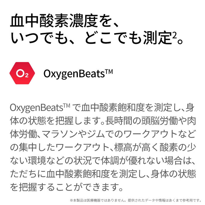 血中酸素濃度(SpO2)測定機能が搭載されており、 この機能が搭載されている数少ないスマートウォッチです。