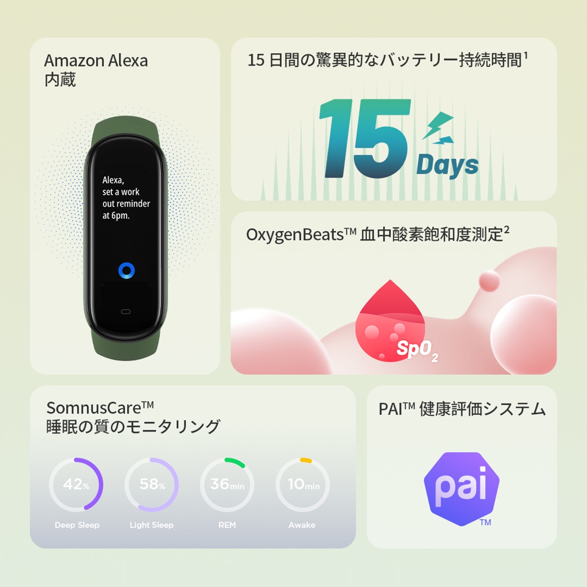 Amazfit band5は本体重量が12gと超軽量かつコンパクトな設計でありながら、 Amazon alexaの音声アシスタント機能を搭載したスマートウォッチ