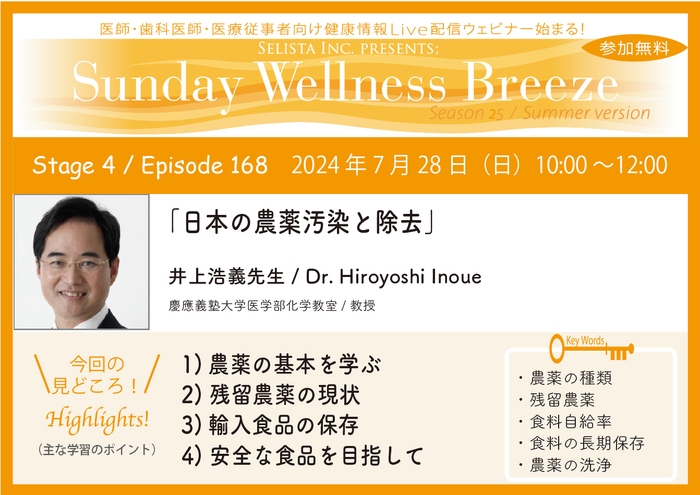 セリスタ株式会社(東京都千代田区 代表取締役 伊藤 承正)は、2024年7月28日(日)に、井上 浩義 先生(慶應義塾大学医学部化学教室/教授)を講師にお迎えし、医師・歯科医師などの医療従事者向け無料Zoomオンラインセミナー『日本の農薬汚染と除去』を開催します。