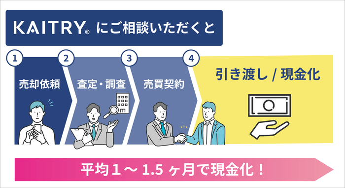 一方、買取会社を利用すると、この期間が短縮され、売却相談から引渡しまでの期間はおおむね1~1.5か月となります(AI査定プラットフォーム「KAITRY(カイトリー)」を利用した場合)。