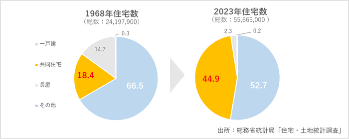 総務省統計局の住宅・土地統計調査によると、1968年には全住宅に占める共同住宅の割合が18.4%だったのに対し、2023年には44.9%まで増加しています。