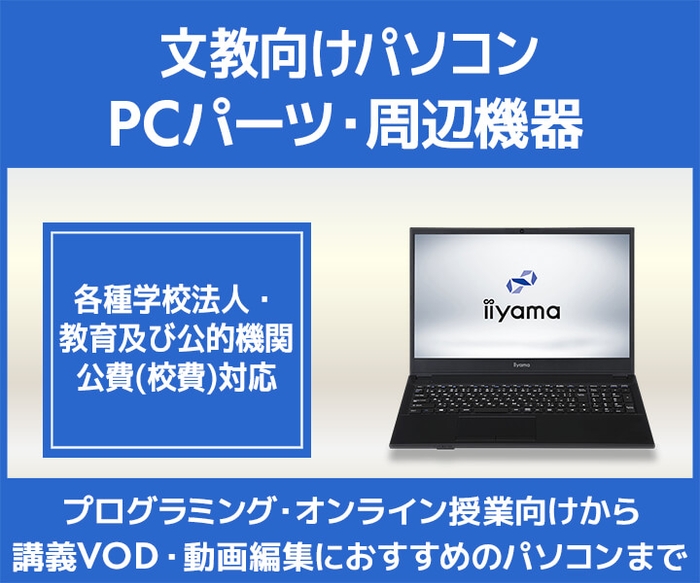 パソコン工房では、プログラミングやオンライン授業、講義VOD・動画編集におすすめ『文教向けパソコン・PCパーツ・周辺機器』特集を開始いたしました。デスクトップパソコンやノートパソコンの他、Chromebook対応周辺機器・モニター・NAS・NAS用HDD・会議用周辺機器など、文教におすすめの商品をご紹介いたします。また、法人・学校・官公庁様の各種導入ご相談などを承っておりますので、お気軽にお問い合わせください。