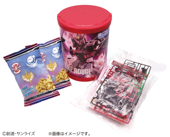 『ガンプラ入りラウンドBOX』は、蓋つきの円筒形ボックスに、本商品オリジナルのガンプラと、コーンポタージュスナック2袋をセットした商品です。ガンプラは、「ENTRY GRADE 1/144 RX-78-2 ガンダム(スノーイメージカラー)」「ENTRY GRADE 1/144 ストライクルージュ(ライトパッケージVer.)」の2種類。どちらも本商品でしか手に入らない限定仕様となっております。