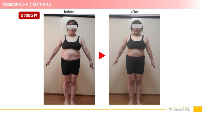 齋藤先生とヘルシーオイル・プラス・コンソーシアムで行った試験では、毎日MCTオイルの小さじ半分程度の摂取で、内臓脂肪の減少がみられ、見た目にも明らかな結果となりました。当日は被験者の1名にお越しいただき、試験中の生活や成果などをご本人にコメントをいただきました。
