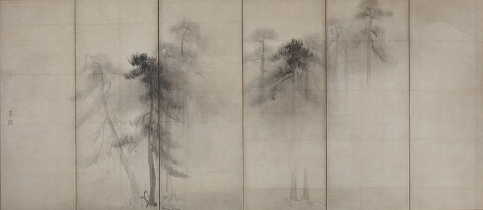 お正月恒例の特別公開。松林という日本の伝統的なモチーフを、中国絵画から学んだ水墨表現によって描き出しています。湿った大気を感じさせる墨一色の松林が広がります。