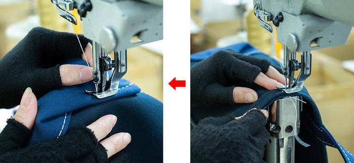 細い棒の先端を軸にして縫うハイポストミシンを使い、トートバッグを立体的に縫います。スピードと角度を調整しながら、地厚な帆布を重ね合わせた三角形を縫製していきます。やり直しのきかない職人技です。