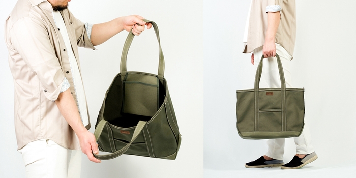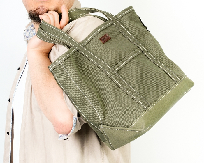 2号帆布を贅沢に使用して作るのが、ベーシックスタイルのトートです。バッグの底マチを三角に折り畳むデザインが特徴的であり、トートバッグとしては最も完成されたデザインといえます。しかし、生地を何重にも重ねるため、針が通りにくく縫製するのが1番難しいデザインでもあります。当社の経験と技術をつぎ込み、トートバッグの極限を形にします。(※トートの底は8号帆布を使用します。)