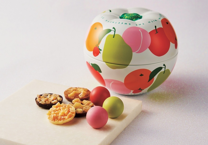 りんご、オレンジ、いちご、もも、洋梨を果実感が楽しめるチョコレートに仕立て、果実柄のキュートな缶にアソート。