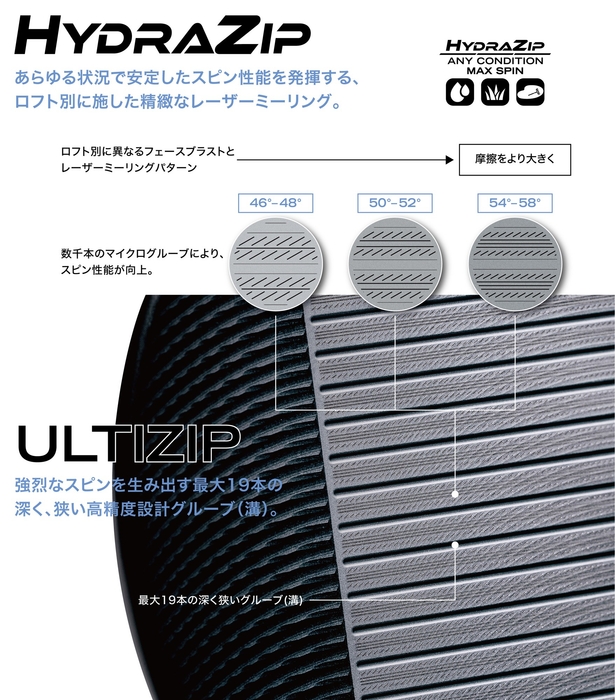 フェースブラストとレーザーミーリング(HYDRAZIP)をロフト別に設計。高精度設計グルーブ(溝)の「ULTIZIP」との組み合わせにより、ラフやウェット時など悪条件下でも優れたスピン性能を発揮します。