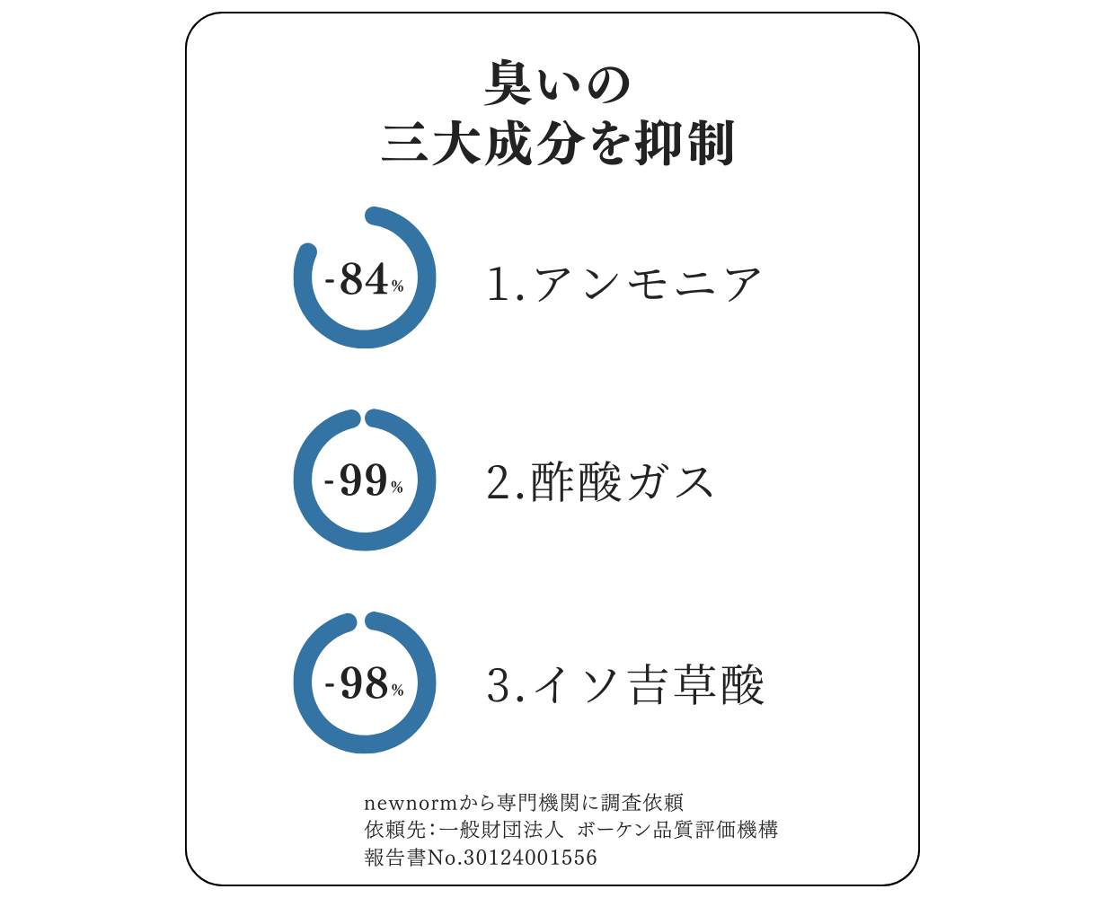 ヘンプ繊維が持つ機能性の一つ、消臭性。臭いが発生する菌は主に「アンモニア」「酢酸」「イソ吉草酸」に分けられ、ヘンプはそのいずれにも高い消臭効果があります。