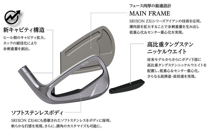 「スリクソン ZXiシリーズ」アイアンの技術を応用し、フェースを軽量化した「MAIN FRAME」を搭載。また、ヒール側のキャビティ部分を広げ、ネック径を細くした「新キャビティ構造」により余剰重量を創出しました。加えて、「高比重タングステンニッケルウエイト」をボディ下部に配置。低重心化&センター重心化によって、さらなる高弾道・高初速を実現しました。また、「スリクソン ZXi4 アイアン」にも搭載された「ソフトステンレスボディ」により、やわらかな打感を実現しています。