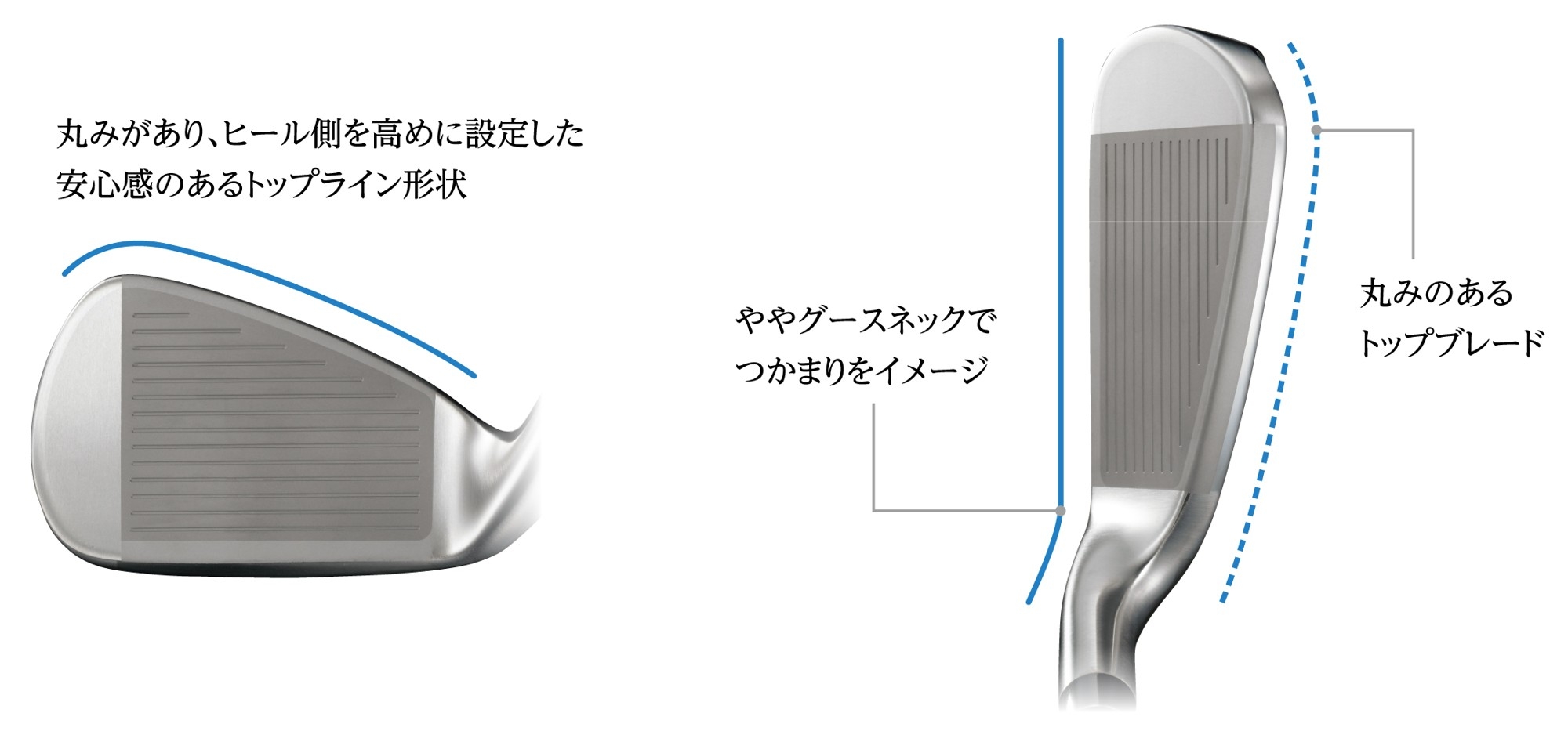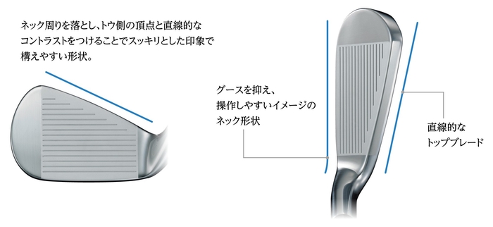 ネックはグースを抑え、操作しやすいイメージの形状を採用。ネック周りの肉を落とし、トウ側の頂点と結んだ直線的なトップブレードが構えやすい印象を与えます。
