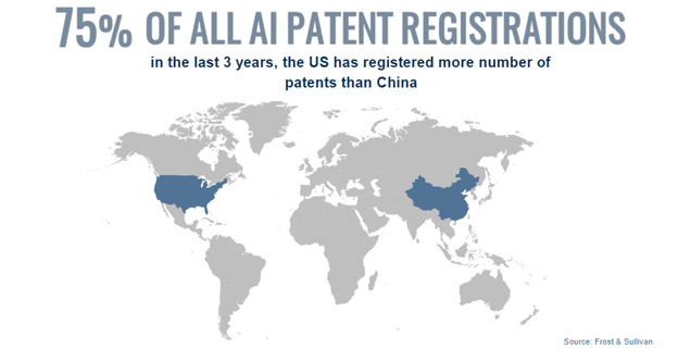 米国は、2016年から2019年の間に2万6000本以上の特許を出願し、世界最高となっている。 主に音声認識のデジタルアシスタント、チャットボットなどのNLP(自然言語処理)ソリューションの開発、パーソナライズされるサービス等の特許出願が多い。一方、中国は2万4000本以上特許を出願し、米国を急速に追い上げている。2030年までにAI分野では米中の競争が更に激しくなると思われる。