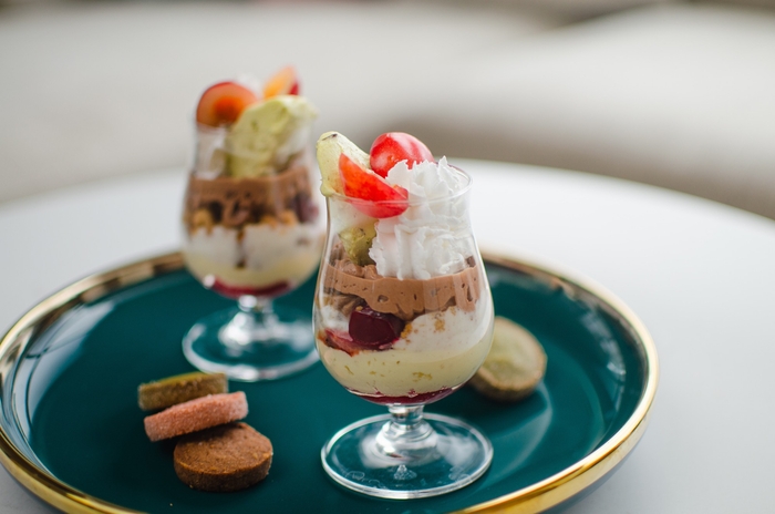 旬のさくらんぼと風味豊かなピスタチオを組み合わせた、見た目も愛らしいミニパフェをご用意。ブランド自慢の「oNCHOCOクッキー」が彩りを添えます。