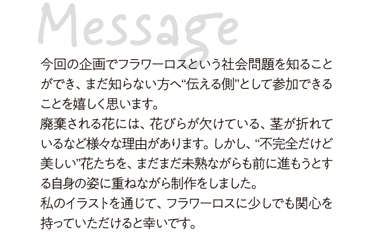 市場出荷規格に満たないとして廃棄される花は生産本数の15%〜30%存在すると言われています。出荷本数から推計するとその年間総廃棄本数は9.25億にも登ります(20%で試算)。わずかに茎に傷がある、茎が真っ直ぐでない、花びらの形が完璧でない等の理由で規格外とされてしまう花たち。ご来場の皆様にお配りすることで、その個性的な姿の魅力を知っていただければ幸いです。