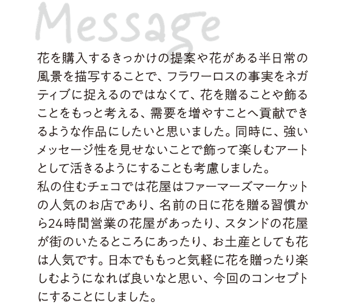 昨年4月緊急事態宣言を受け行き場を失ってしまったために突如大量に発生したフラワーロスの現実を解決するため立ち上げた生家のオンラインD2C販売「スマイルフラワープロジェクト」https://jfc.thebase.in を始めとして、フラワーライフ振興協議会の立ち上げ、フラワーロスの社会課題の解決に向け、持続可能な生産と流通改革、農家支援のための取り組みを行なっている。