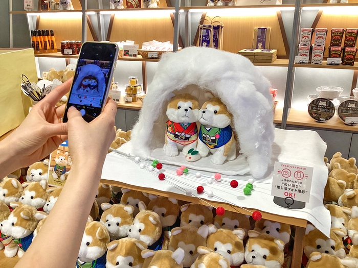 今月販売を開始した日本の代表的な伝統衣装として知られる和服、着物のデザインに身を包んだ同店1番人気「ハチふるぬいぐるみ」の登場に合わせ、ぬいぐるみサイズの“和室”やハチのふるさと秋田の“かまくら”を設置。同店で販売しているぬいぐるみだけでなく、お客様が持参した推しグッズやぬいぐるみなどを一緒に撮影をすることもできます。