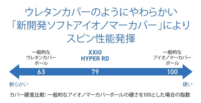 ウレタンカバーのようにやわらかい「新開発ソフトアイオノマーカバー」を採用することで、飛距離重視系ボールの中でも、優れたスピン性能を誇ります。