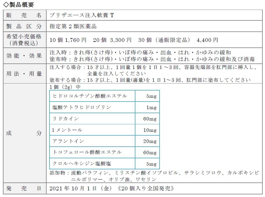 「プリザエース注入軟膏T」は2004年に発売し、日頃よりご愛顧いただいておりましたが、この度、生活者の皆さまからのご要望にお応えし、従来の10個入りに加え、新たに大入り包装の20個入りを発売することとなりました。「プリザエース注入軟膏T」は、炎症を抑えるヒドロコルチゾン酢酸エステルなど7つの有効成分を配合し、痔の症状である痛み、出血、はれ、かゆみを緩和します。また、痔のタイプに合わせて、注入と塗布2通りの使用方法が選べます。患部や薬剤に直接手を触れず、衛生的にご使用いただけます。