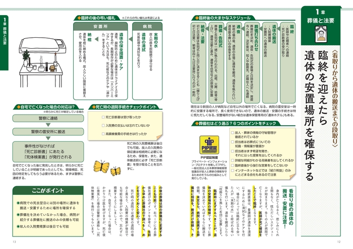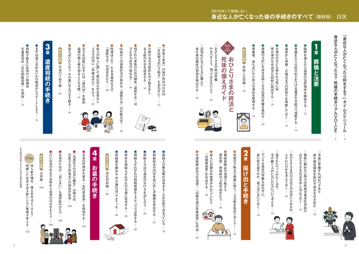 4大手続き「葬儀と法要」「役所への届け出」「遺産相続」「お墓」の流れとポイントが一目でわかる図解とタイムスケジュール表に、とじ込みブックでは最新の「おひとりさまの終活と手続き」も紹介。
