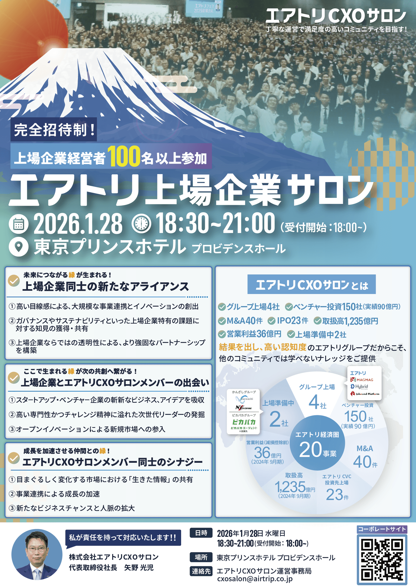 ITの力で、エアトリ旅行事業、ITオフショア開発事業、訪日旅行事業・Wi-Fiレンタル事業、メディア事業、投資事業(エアトリCVC)、地方創生事業、クラウド事業、マッチングプラットフォーム事業、CXOコミュニティ事業、HRコンサルティング事業、航空会社総代理店事業、レンタカー事業、海外ツアー事業、法人DX推進事業・ヘルスケア事業(以降の事業は投資先にて注力)、人材ソリューション事業、クリエイティブソリューション&DX事業、AIロボット事業、ゴルフライフサポート事業、外貨自動両替機事業と町家宿泊・日本文化体験事業を含む全20事業を手掛ける株式会社エアトリ(本社:東京都港区、代表取締役社長 兼 CFO:柴田 裕亮、証券コード:6191、以下当社)は、子会社の株式会社エアトリCXOサロン(本社:東京都港区、代表取締役社長:矢野光児)らが、CXOコミュニティ事業として運営する、完全招待制経営者コミュニティ「エアトリCXOサロン」にて、「エアトリ上場企業サロン」を2026年1月28日(水)に開催を決定いたしました。