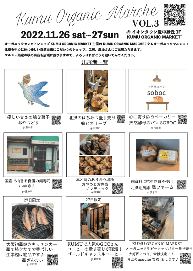 北摂のオーガニック・無添加商品を集めた「KUMU ORGANIC marché」、VOL.3を11月26日.27日イオンタウン豊中緑丘KUMU ORGANIC MARKETにて開催致します!