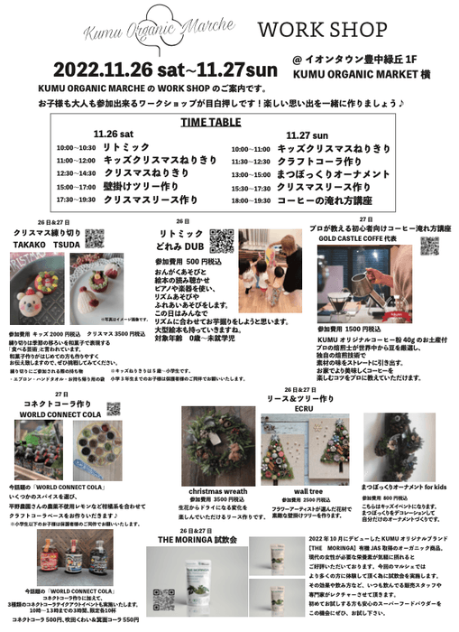ワークショップ:リトミック、練りきり、クリスマスリース制作、コネクトコーラ制作、プロが教えるコーヒーの淹れ方講座、THE MORINGA試飲会