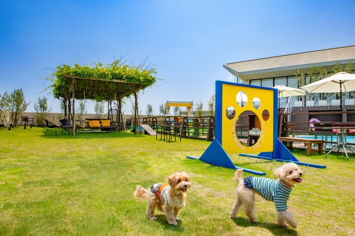 有明海を一望できる庭園には、ワンちゃんが元気に駆け巡ることができる天然芝の屋外ドッグランを島原半島で初めて完備。(屋外330m2)