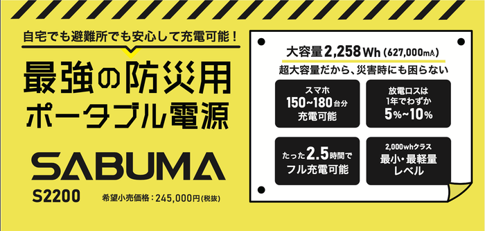 株式会社アピロス(本社:東京都港区)は、超大容量2,258Wh、瞬間最大出力4,000Wのポータブル電源「SABUMA(サブマ)S2200」を6月9日からインテックス大阪にて開催される【防犯防災総合展2022】に出展いたします。