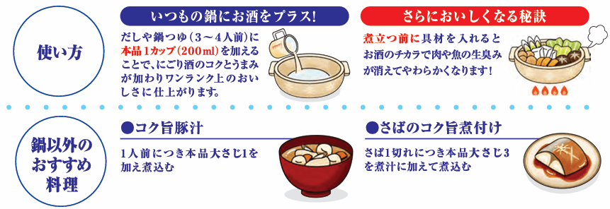 “タカラ「料理のための清酒」<旨にごり>”は、にごり酒のコク深い甘みのある料理清酒なので、市販の鍋つゆや出汁に加えると、いつもの鍋料理がワンランク上のコク深いおいしさ※1に仕上がります。冬に求められる「濃い、コクのある味わい」※2になることに加え、酸味・塩カドが取れてまろやかになる調理効果もあります。