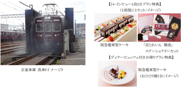 ・1泊2日のプランでは、ホテル阪急インターナショナルのトレインビュールームにて、阪急電車型ケーキ・「京とれいん 雅洛」ステーショナリーセット・阪急電車と同じシート素材を使った「コースター」(1部屋に1セット)をご用意しました。※夕朝食なしのプランです。