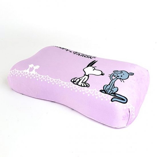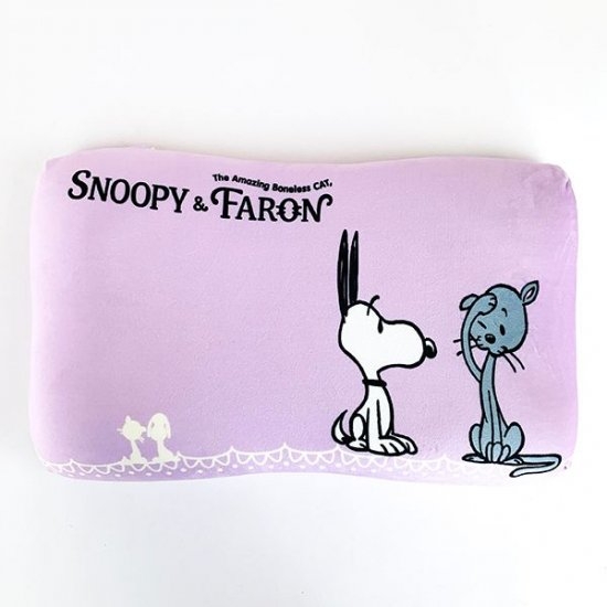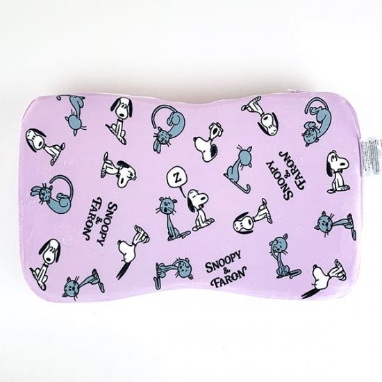 こちらは、パステルトーンのパープル地がきれいな、スヌーピー&ファーロンデザインの枕です。左側にもシルエットのスヌーピー&ファーロンが描かれていて、かわいいですよ♡