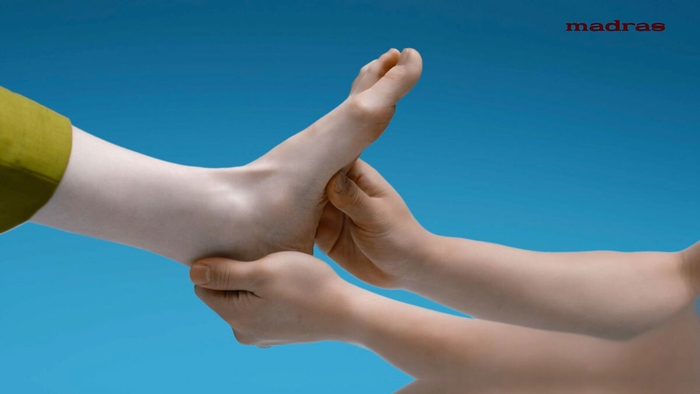 madrasリカバリーインソール「metaインソール(R)」は、歩く度に血行を促進する特許取得済のインソールです。インソール内部に使用している超柔軟ゲル「クリスタルゲル(R)」の硬度を部位ごとに変えた特殊設計で、このうち硬めに設計された土踏まず部分が指圧のように足裏に軽い刺激を与えます。その「metaインソール(R)」の持つ指圧の効果を、「浪越指圧」の浪越友哉さんがモデルの足裏を指圧する映像で表現。歩く度に血行が促進され疲労回復につながる様子を、モデルが心地よい浮遊感に包まれる演出で表現しています。