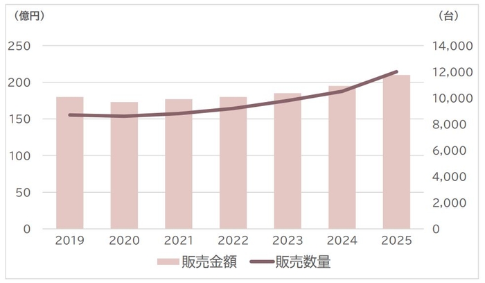 介護ロボットの市場規模は、2022年の実績として金額ベースで約180億円、台数ベースで約9,000台強であったと推定される。2020年は、コロナ禍で設備の新規導入や更新が滞ったこと、メーカーの営業活動が自粛された影響から、介護ロボットの市場も縮小したが、2021年には持ち直し、22年も市場の拡大が続いた。