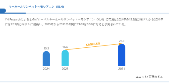 YH Researchによるとのグローバルキーホールリンペットヘモシアニン(KLH)の市場は2024年の15.3百万米ドルから2031年には22.9百万米ドルに成長し、2025年から2031年の間にCAGRは5.5%になると予測されている。この成長は、技術革新や需要の高まり、産業構造の変化といった要因に後押しされています。