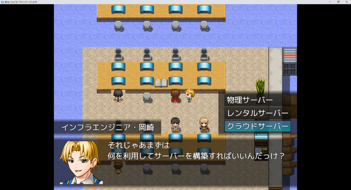 「もしインターンとして業務をするなら」という設定を前提としているため、キャラクターと会話を交わしながら業務内容を把握していき、サーバーの障害対応からシステムのデバッグ作業までを体験することができます。