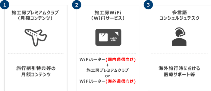 合弁会社では、旅工房による旅行割引特典などが受けられる「①旅工房プレミアクラブ(仮称)」、光通信グループから提供される通信サービスを活用した国内旅行者向けのインターネットサービス「②旅工房Wi-Fi(仮称)」並びに、インバウンドテックから海外旅行者向け「②旅工房グローバルWi-Fi(仮称)」及び海外旅行時のコロナ感染や医療相談など、旅行先で使える通訳サービス「③多言語コンシェルジュデスク(仮称)」のサービスの企画・提供を予定しており、今後もサービスメニューは随時拡大してゆく予定です。