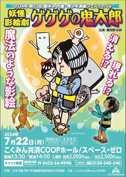 日本児童・青少年演劇劇団協同組合主催、第52回夏休み児童・青少年演劇フェスティバル参加作品「妖怪影絵劇『ゲゲゲの鬼太郎』」 が2024年7月22日 (月)にこくみん共済 coopホール(全労済ホール)/スペース・ゼロ(東京都渋谷区代々木2-12-10)にて上演されます。