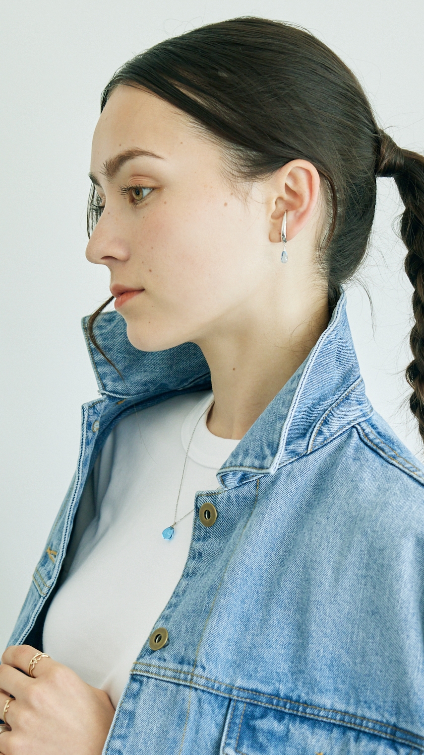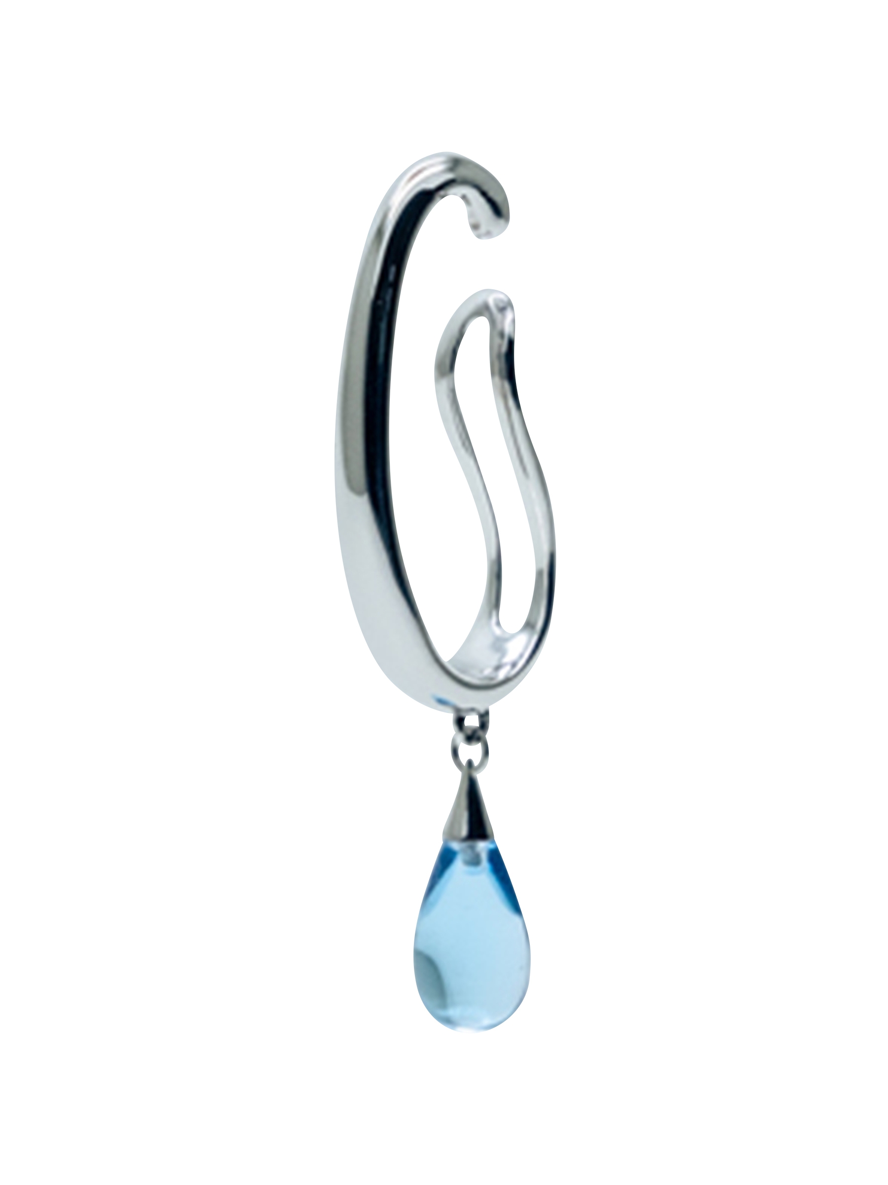 ブルートパーズが耳の下で揺れるデザイン。宝石が引き立つようにデザインは極限までシンプルに。イヤーカフのストッパー部分にこだわり、耳の厚みに合わせてシルバーのバネ性が効くように耳当たり部分を丸線のアーチ状に。
